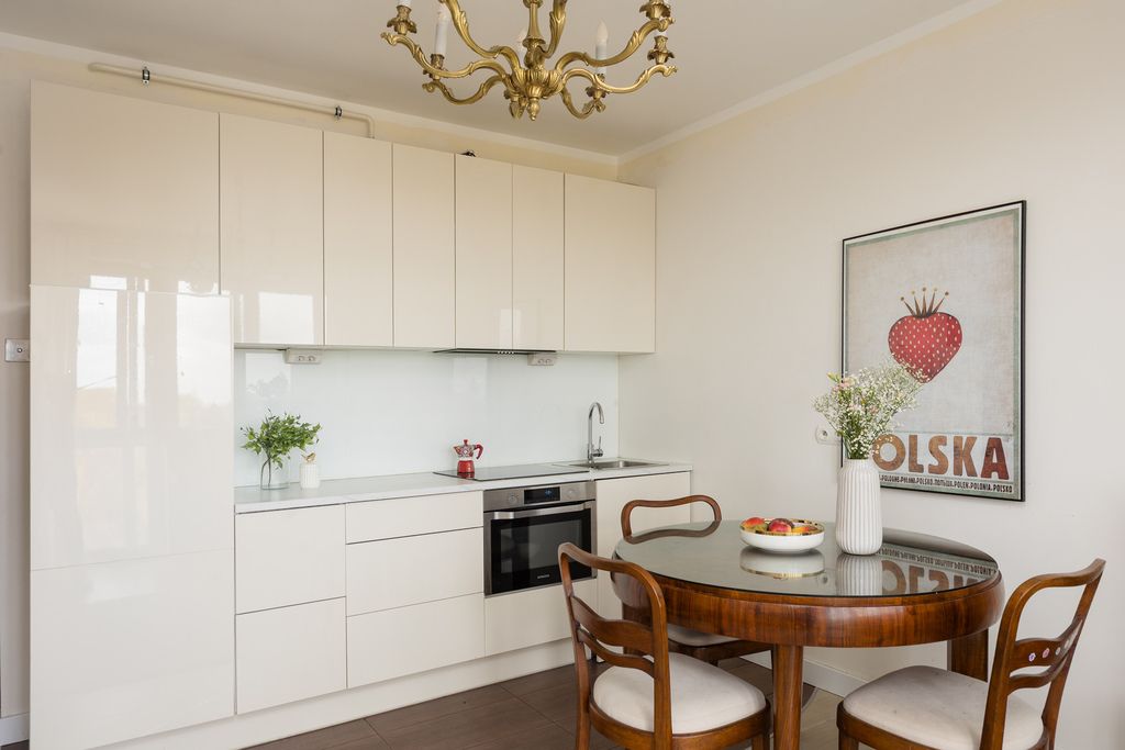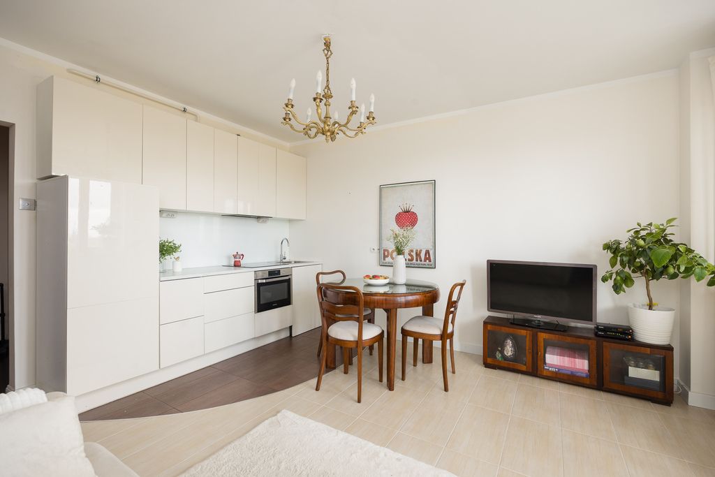 Mieszkanie jest jasne i zadbane. Na podłodze w sypialni znajduje się drewno egzotyczne, w salonie panele, a w pozostałych pomieszczeniach gres. Aneks kuchenny wyposażony został w komplet sprzętów AGD: zmywarkę, piekarnik, płytę indukcyjną, lodówkę z zamrażarką oraz okap.