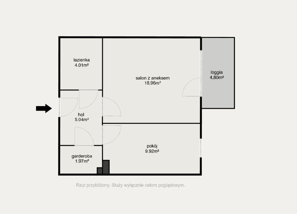 - salonu z aneksem kuchennym (18,96 m²) oraz wyjściem na dużą, przeszkloną loggię (4,80 m²) od strony wschodniej,