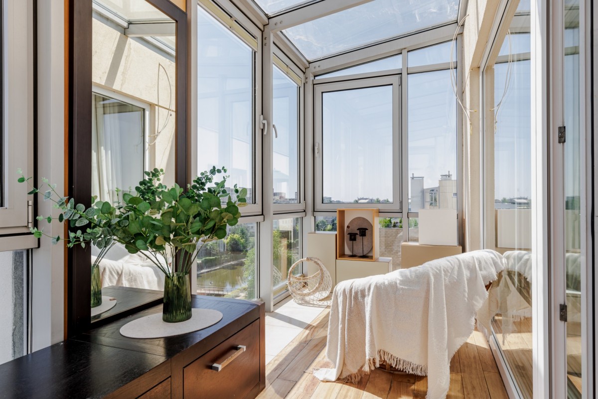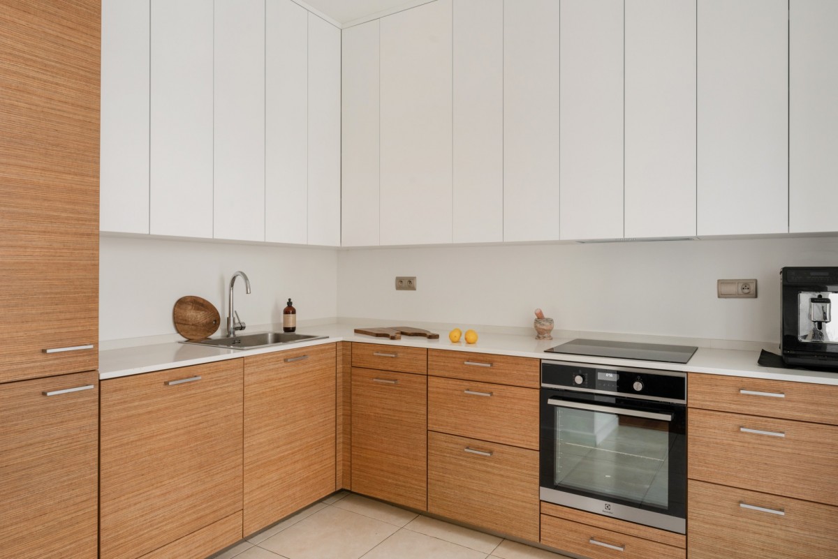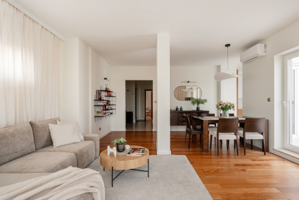 The entire apartment is very bright. The living room, terrace and winter garden are located on the south side, the other part of the apartment is on the west side. The apartment was designed by an architect, finished using the highest quality materials, custom-made furniture, and the floor is decorated with exotic parquet. The apartment is fully functional and equipped with all necessary household appliances.