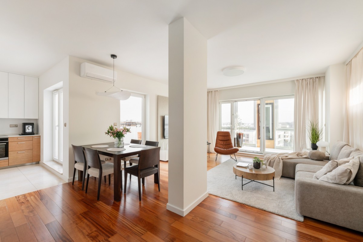 Mamy niezwykłą przyjemność zaprezentować Państwu przestronny penthouse z tarasem, zlokalizowany w zaciszu zielonej Mariny Mokotów.