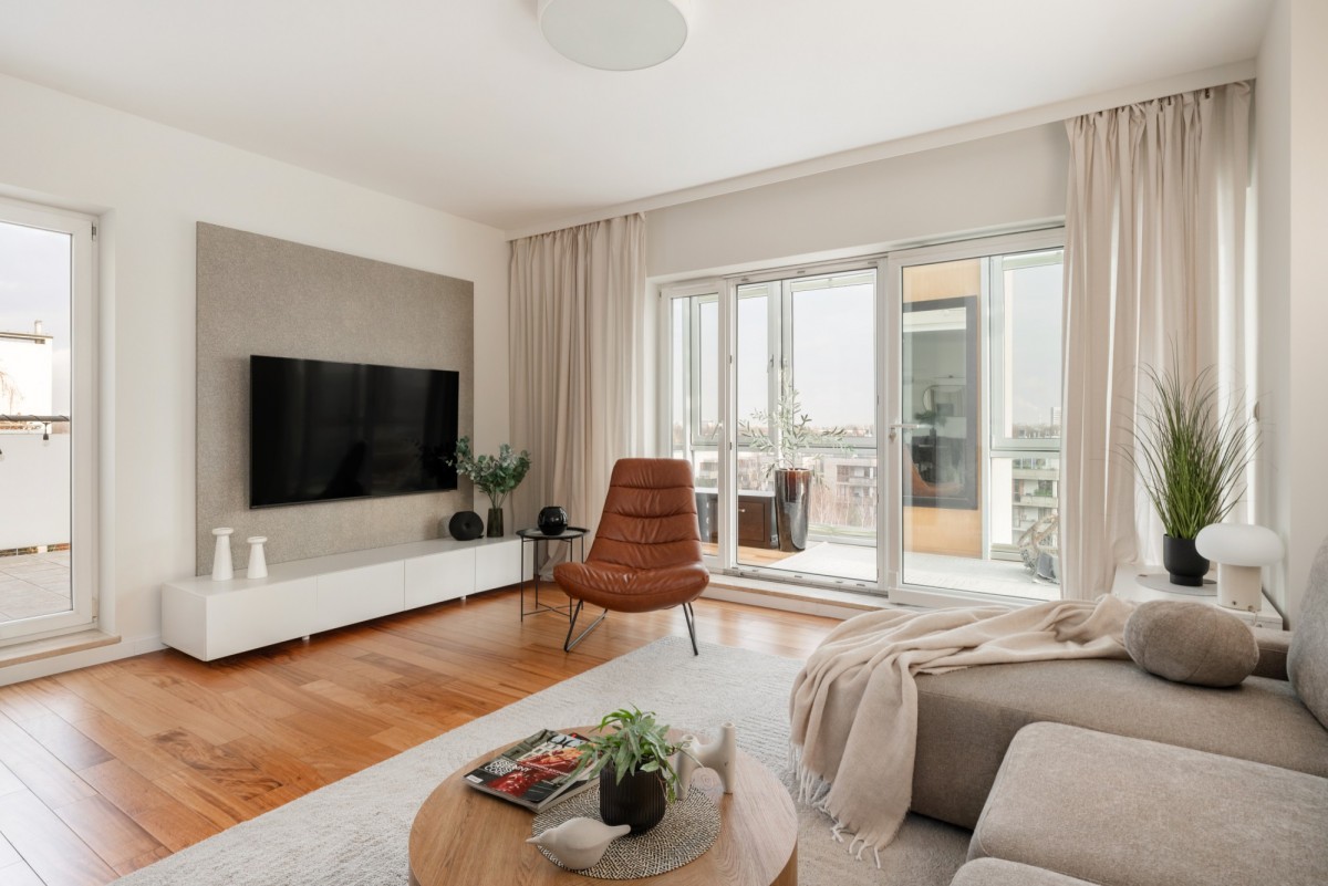 We have the great pleasure of presenting you a spacious penthouse with a terrace, located in the privacy of the green Marina Mokotów.