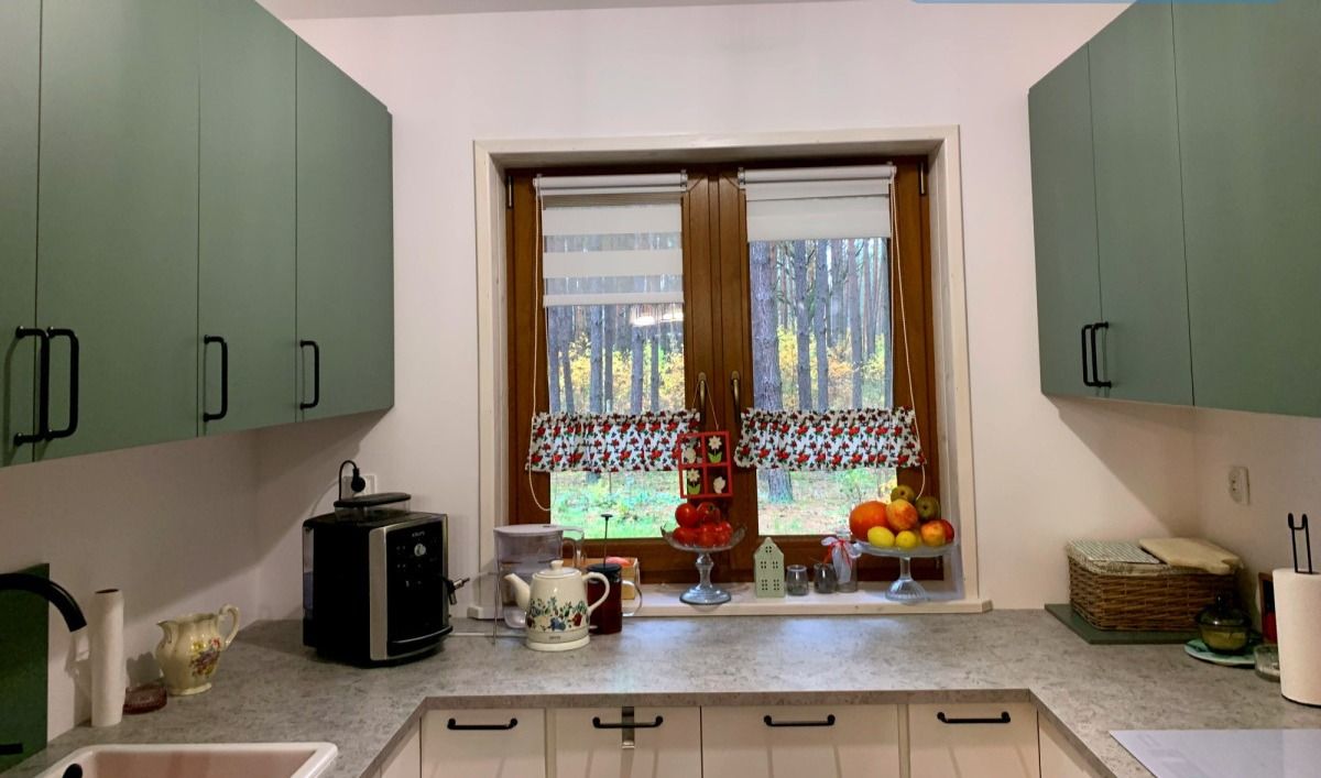 Kuchnia z oknem z widokiem na las, pięknie urządzona i wyposażona - otwarta na gustowny salon, z którego wychodzimy na taras przez olbrzymie balkonowe drzwi.