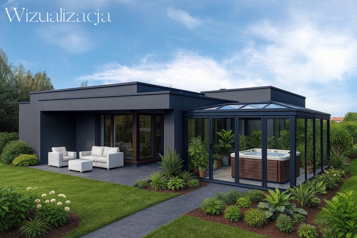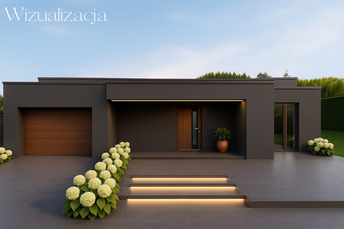 - Minimalistyczna bryła, płaski dach, grafitowa elewacja