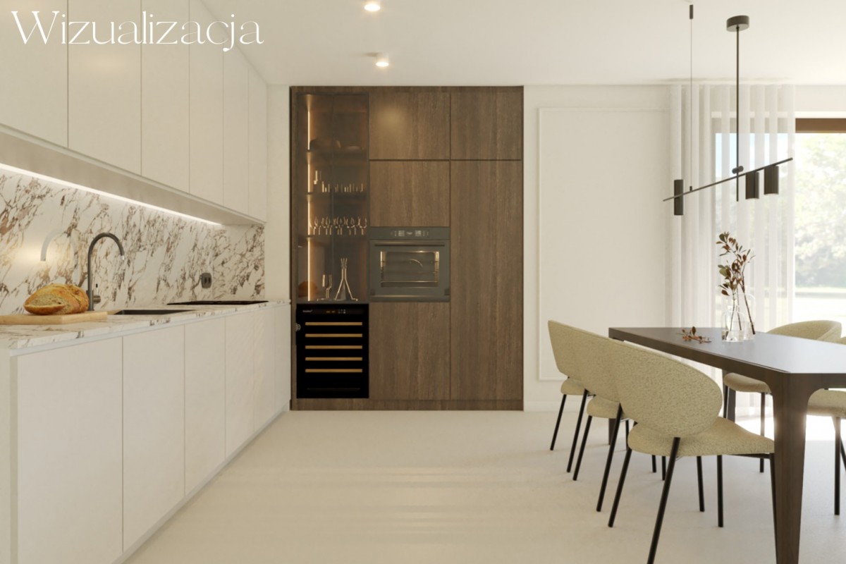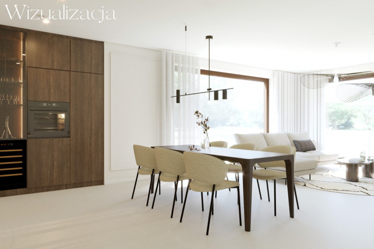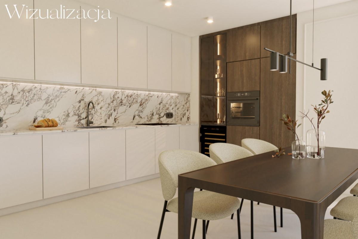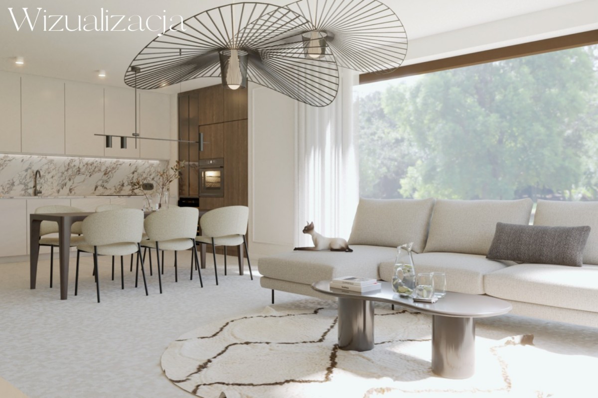 - 4 pokoje (w tym 2 sypialnie z garderobami + gabinet/sypialnia) oraz kuchnia z jadalnią