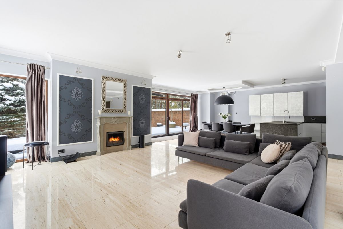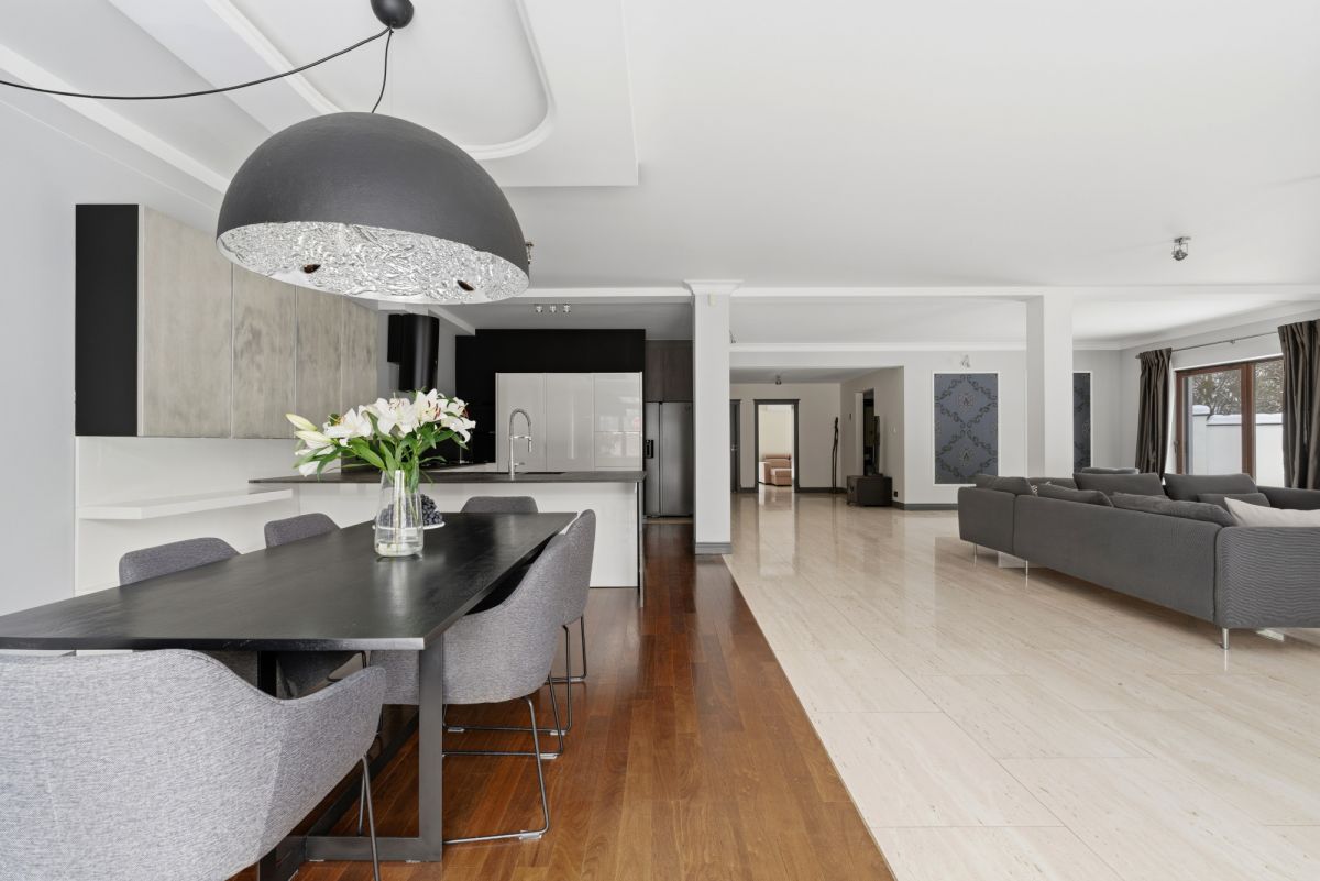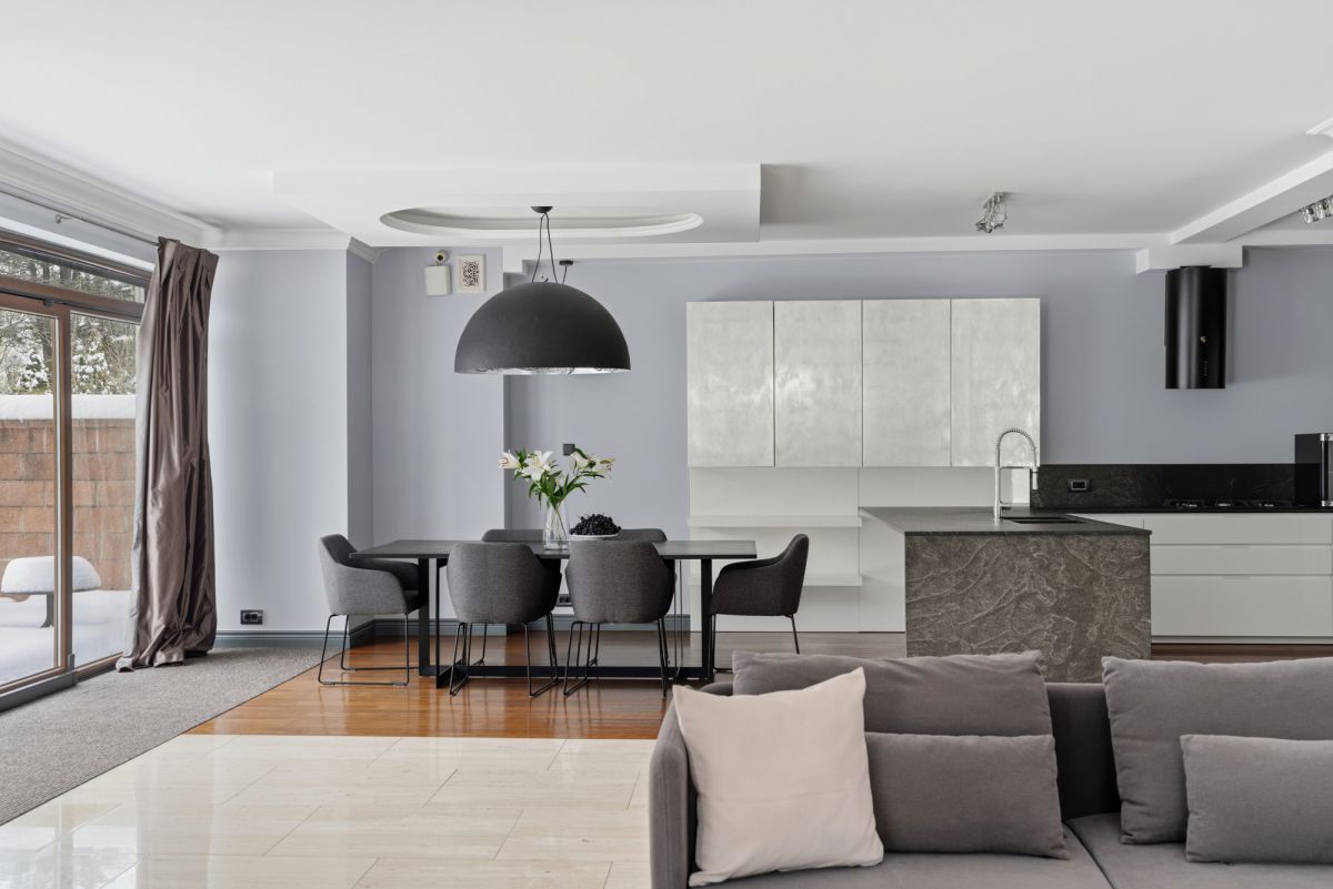 Imponujący, reprezentacyjny salon połączony z kuchnią i jadalnią