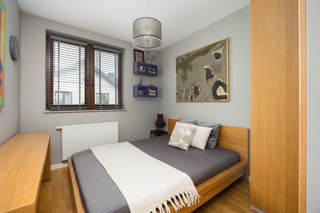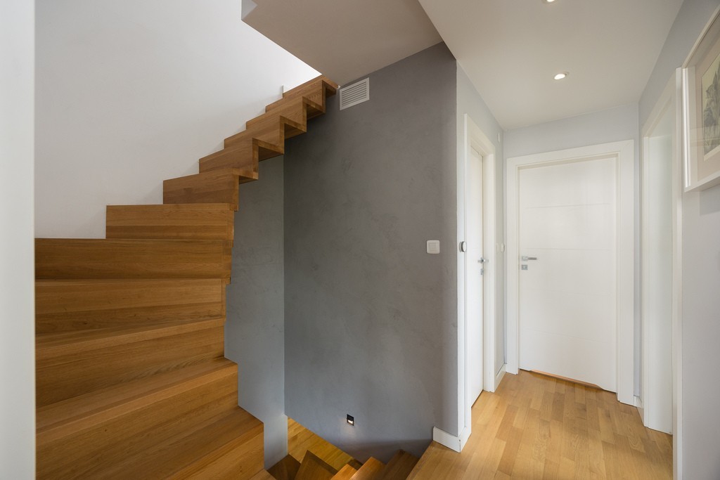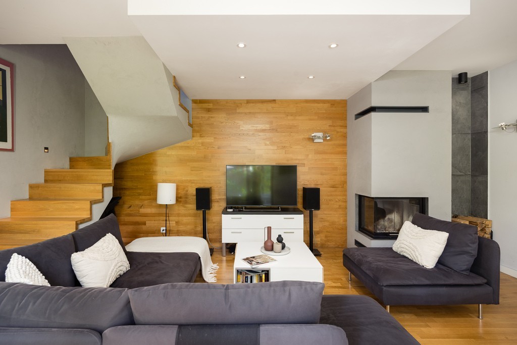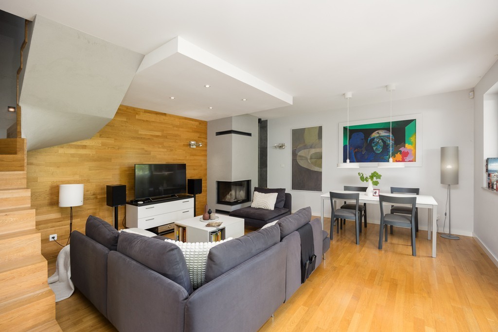 Segment został zaprojektowany przez architekta wnętrz i urządzony w eleganckim niepowtarzalnym stylu z dbałością o każdy detal. Drewniane dębowe podłogi wielowarstwowe stosowane przy ogrzewaniu podłogowym, meble wykonane na wymiar i przemyślana kolorystyka tworzą harmonijną całość. Komfort codziennego użytkowania podnosi ogrzewanie podłogowe, które zostało zainstalowane w wiatrołapie, kuchni, salonie oraz łazience na piętrze. Dodatkowo piękny kominek pełni nie tylko funkcję estetyczną, ale także grzewczą. Szamotowa akumulacja w kominku pozwala na magazynowanie ciepła oraz jego powolne uwalnianie. Dodatkowo kominek ma powietrzne rozprowadzenie po pomieszczeniach i jest sterowany komputerowo. Te wszystkie funkcje zapewniają, że segment staje się nowoczesny, ekologiczny i tani w utrzymaniu. W mieszkaniu mamy także sterowanie oświetleniem poprzez aplikacje, a dla zwiększenia bezpieczeństwa w nieruchomości zainstalowany został system alarmowy, a ściany łączone z sąsiadami zostały dodatkowo wygłuszone.