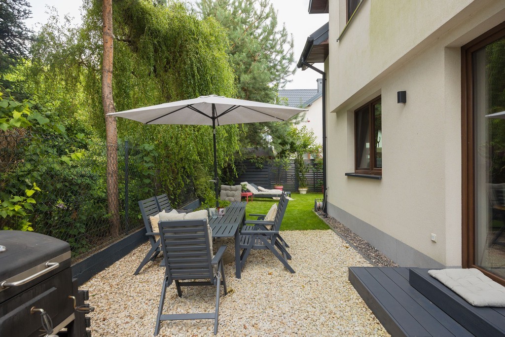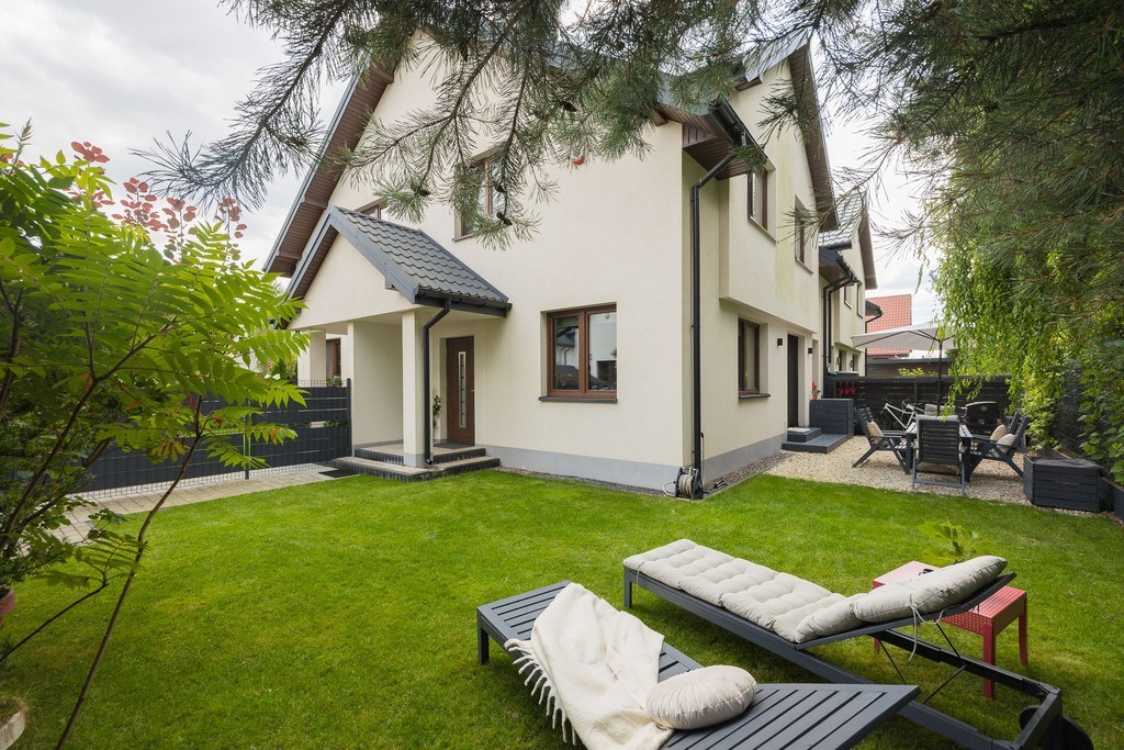 Do posesji dotrzemy ustronnym zielonym korytarzem dzięki czemu spacerujący nie zaglądają przez ogrodzenie. Nieruchomość posiada wyjątkowy kameralny, cichy i zielony ogród bez okien sąsiadów czy widoku na parking. Spędzanie w nim czasu pozwala na relaks i podziwianie natury. Z dwóch sypialni na piętrze mamy widok także na zieleń, a rano przy otwartym oknie może nas obudzić co najwyżej śpiew ptaków. Przed budynkiem znajdują się dwa prywatne miejsca postojowe, dostępne za dodatkową opłatą 30 000 zł za każde. Dom ogrzewany jest gazowo Na uwagę zasługują również niskie koszty utrzymania – średnie opłaty miesięczne przy 4 osobowej rodzinie są w granicy 650 zł ( gaz, woda, szambo, śmieci), co czyni tę nieruchomość wyjątkowo ekonomiczną w eksploatacji. Do najbliższego przystanku autobusowego mamy zaledwie dwie minuty spacerem.