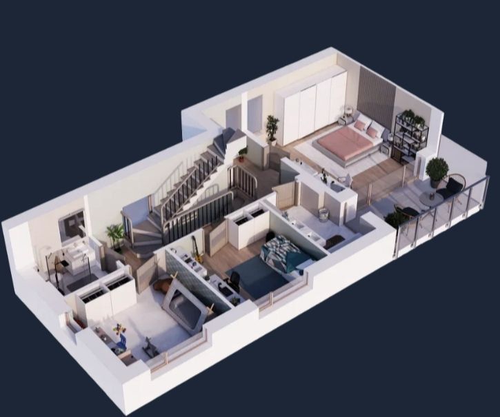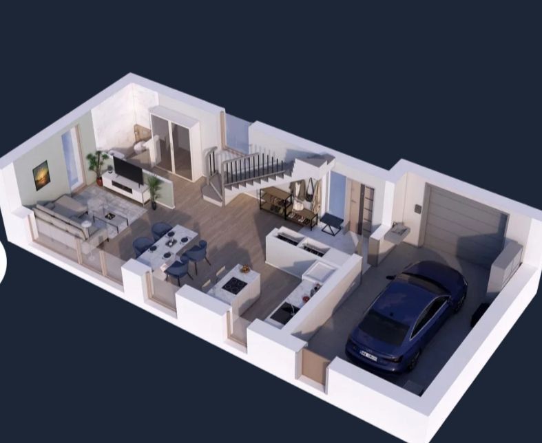 • Parter: przestronny salon z aneksem kuchennym i wyjściem na ogród, łazienka, wiatrołap z wejściem do garażu.