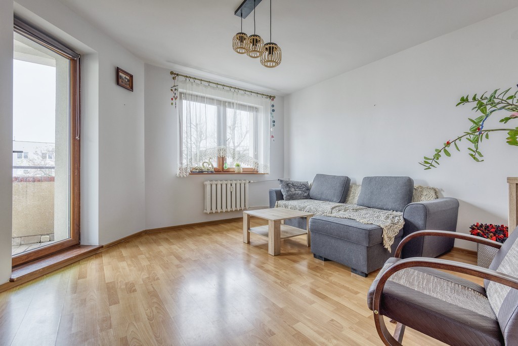 -jasny, ustawny salon z wyjściem na balkon z oknami od strony zachodniej.
