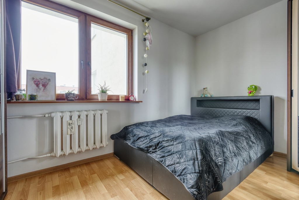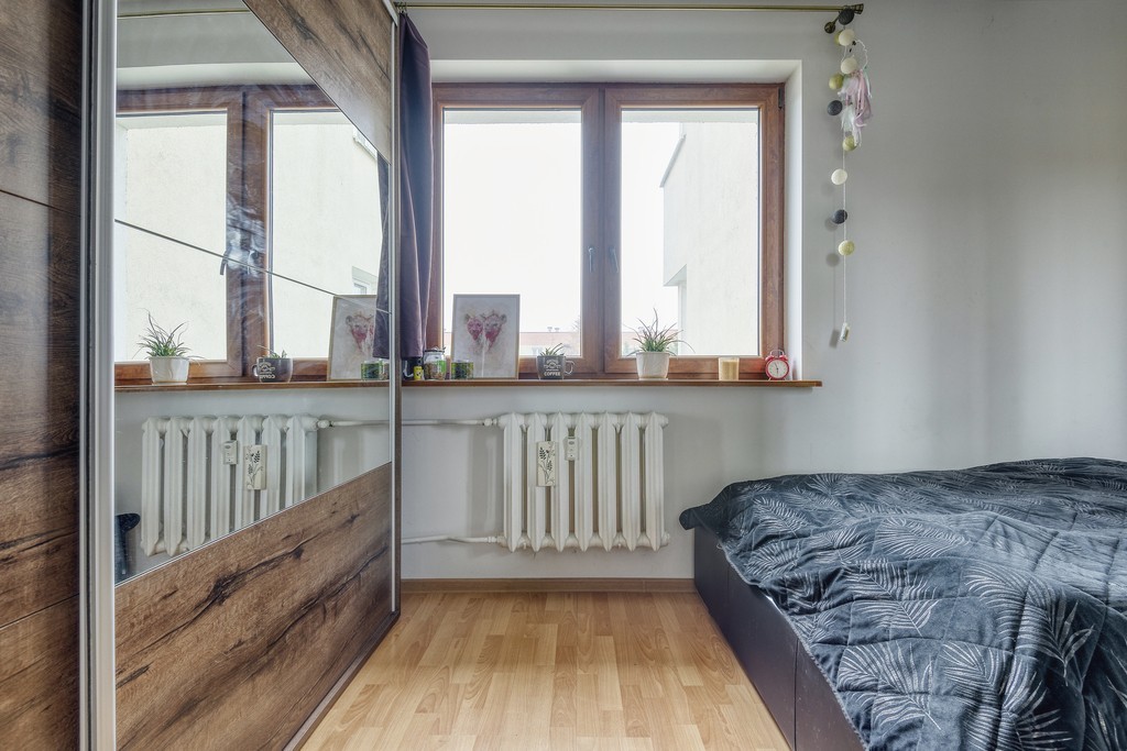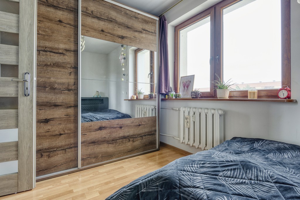 -przytulna sypialnia z dużą szafą z oknem na stronę wschodnią.