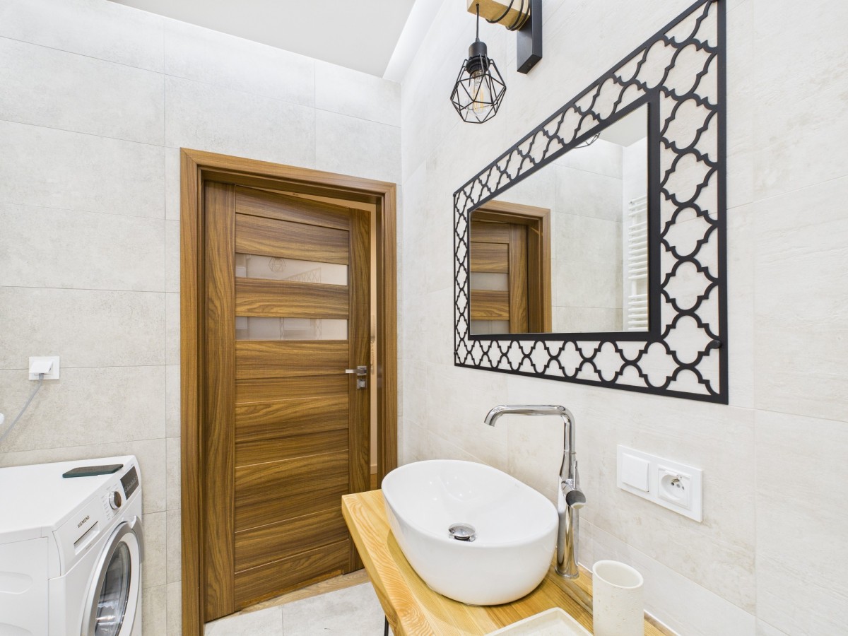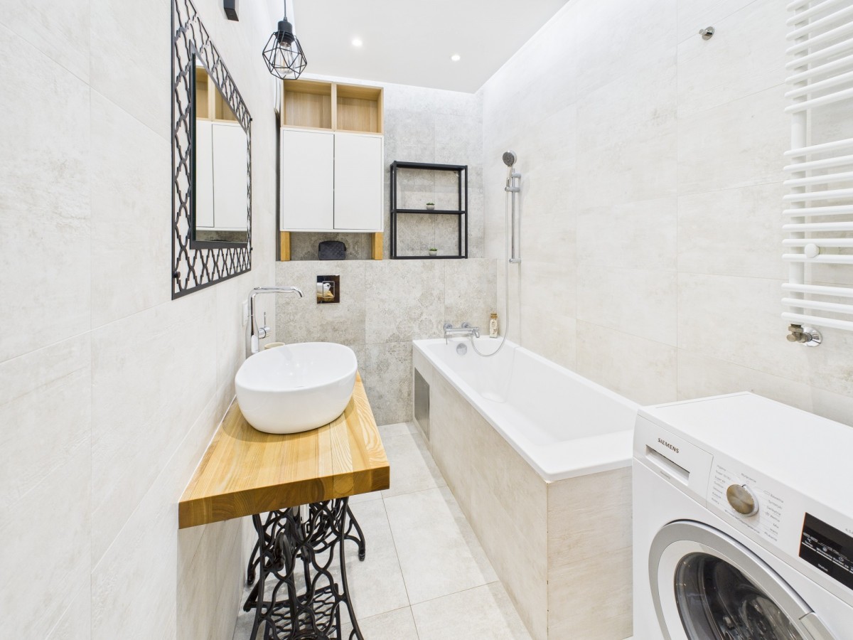 - stylowa, duża łazienka (ok. 4,7 m²) z wanną i pralką,