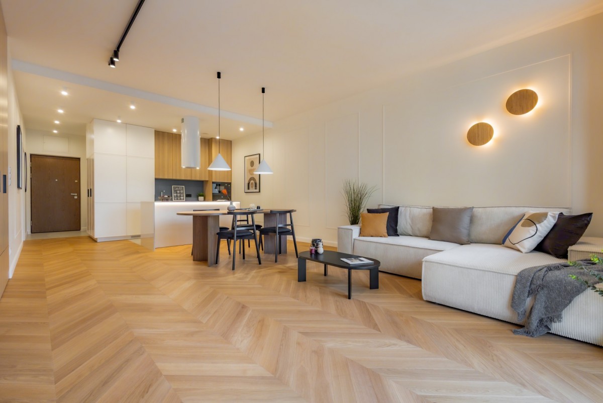 - Przestronny salon z jadalnią, doświetlony dużymi oknami z wyjściem na kształtny duży balkon