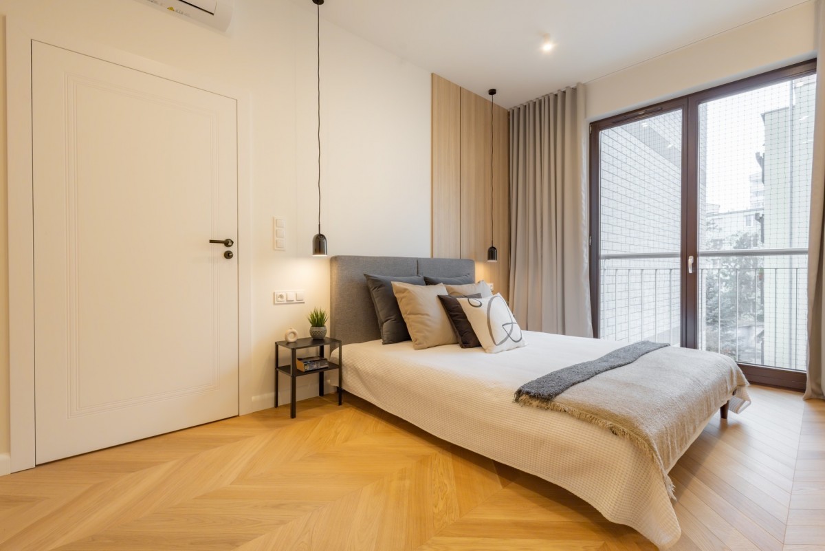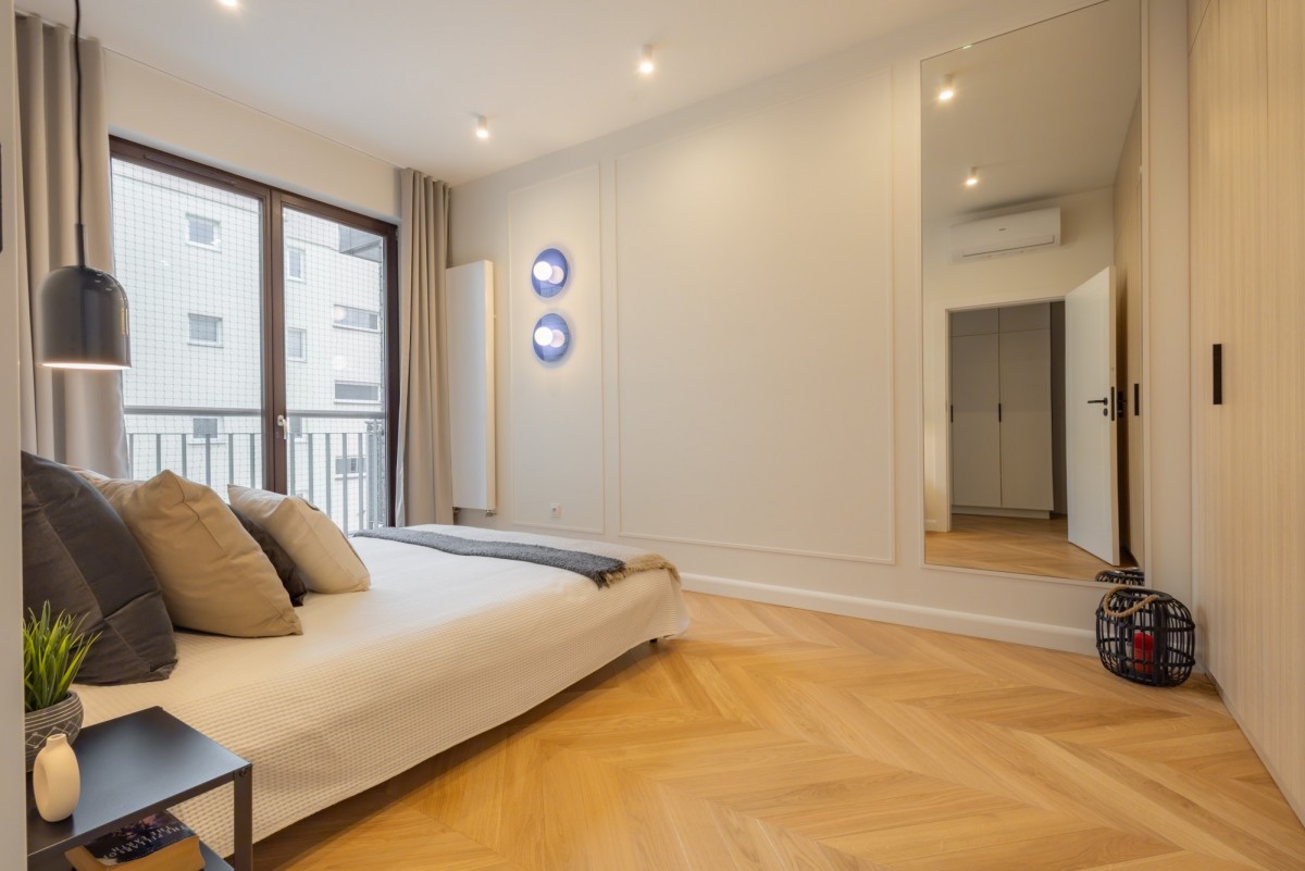 - Komfortową, ustawną sypialnię główną z balkonem francuskim oraz szafami z zabudowie