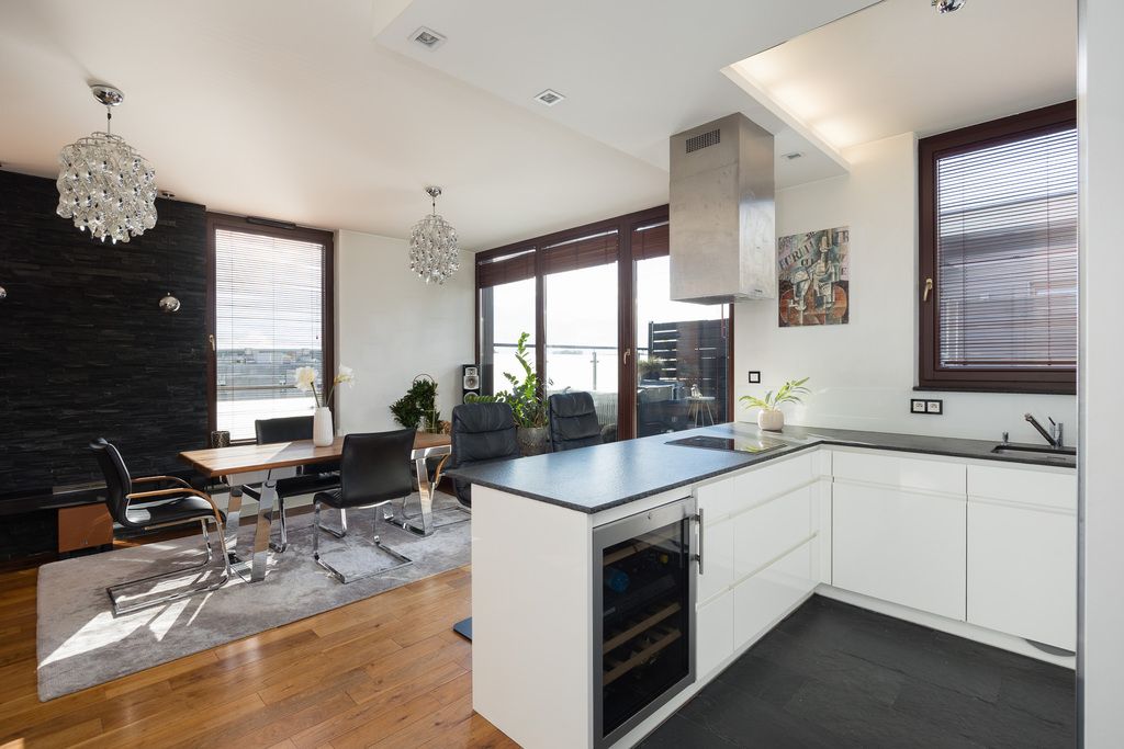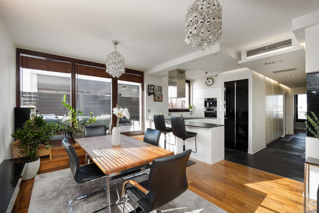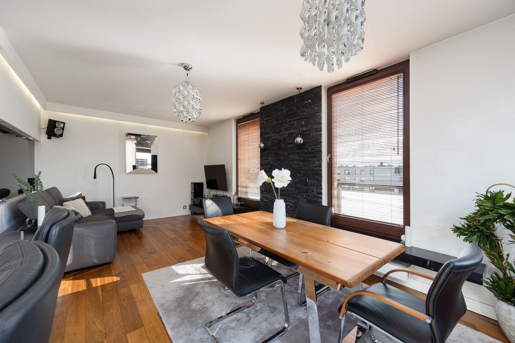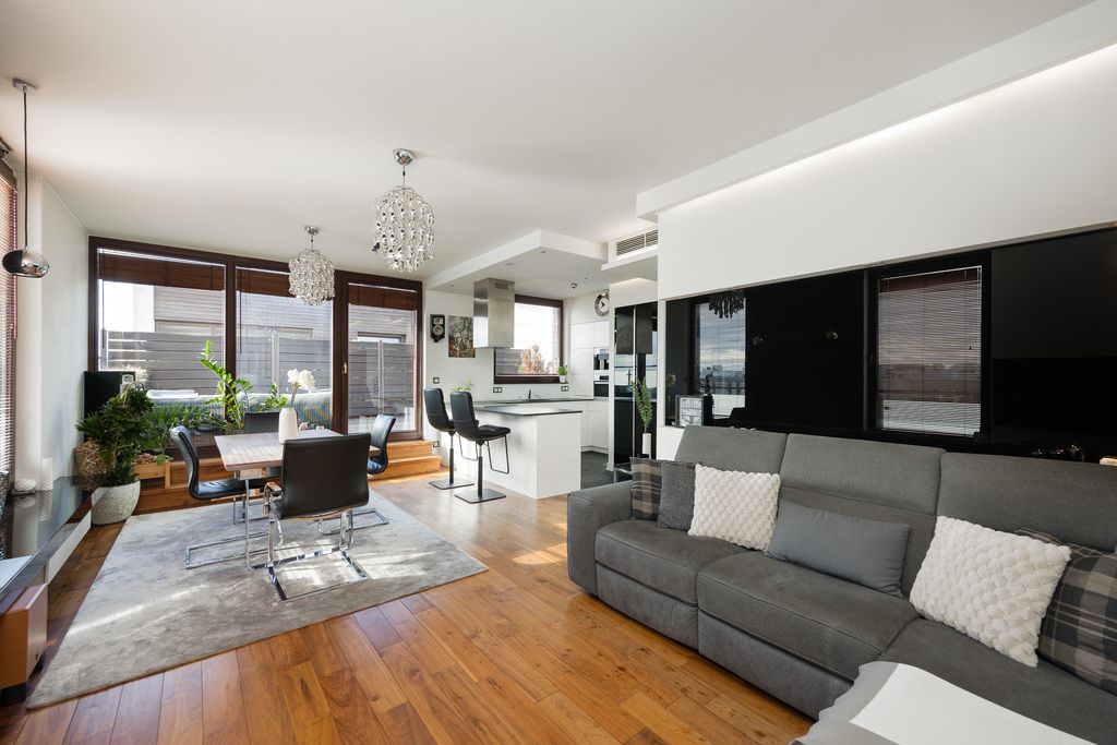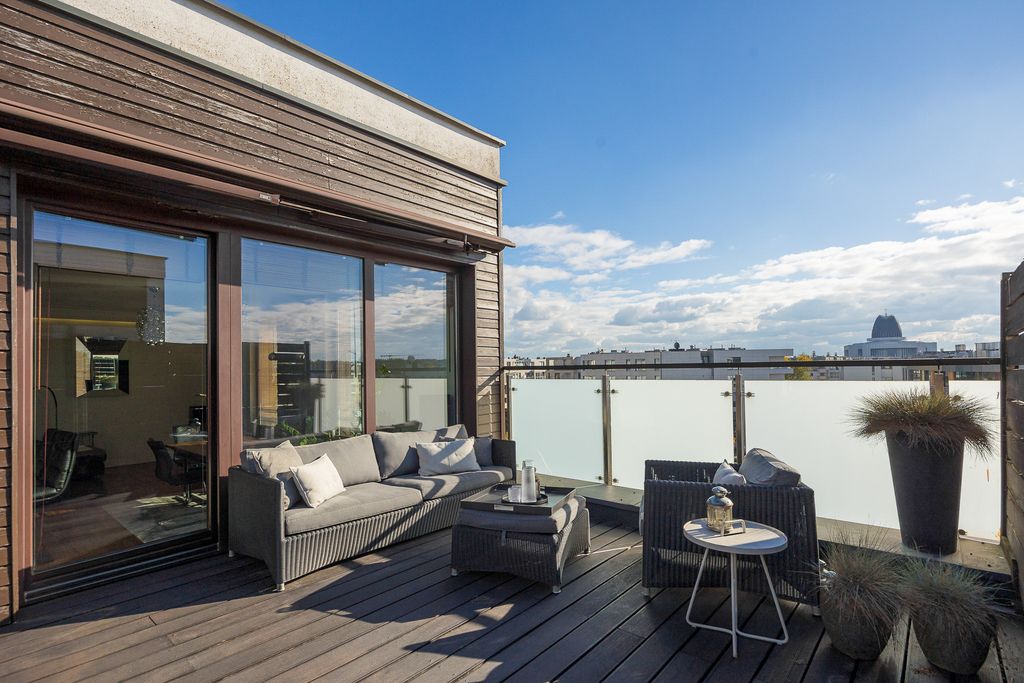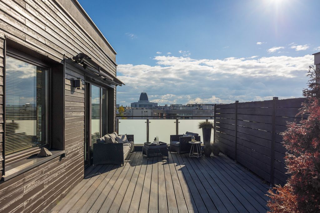 A luxurious two-bedroom apartment with a large terrace, located on the top (fourth) floor of the prestigious Scandinavian House development at 18 Rzeczypospolitej Avenue, in the heart of Miasteczko Wilanów.