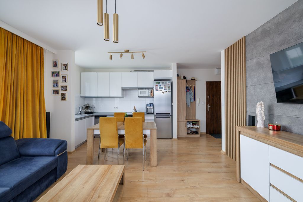 Mieszkanie łączy wygodę miejskiego życia z atutami zielonego otoczenia i bogatej infrastruktury.