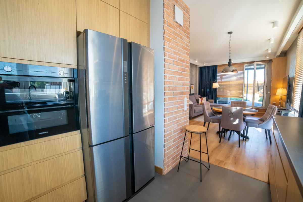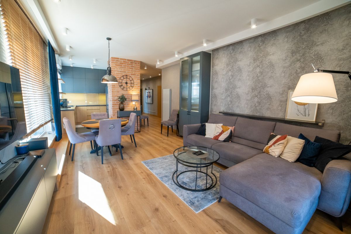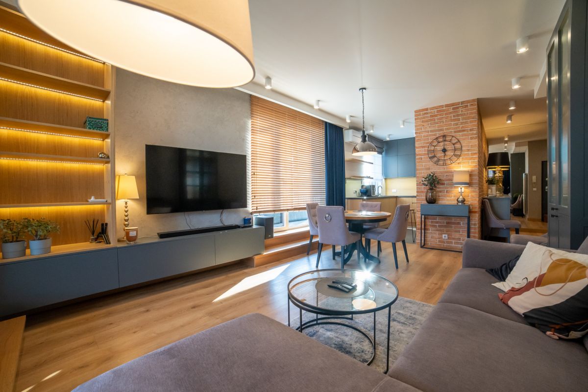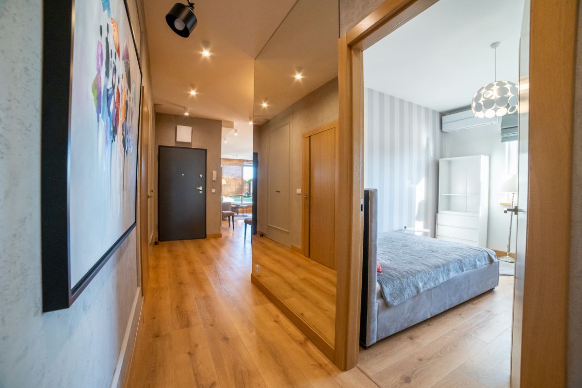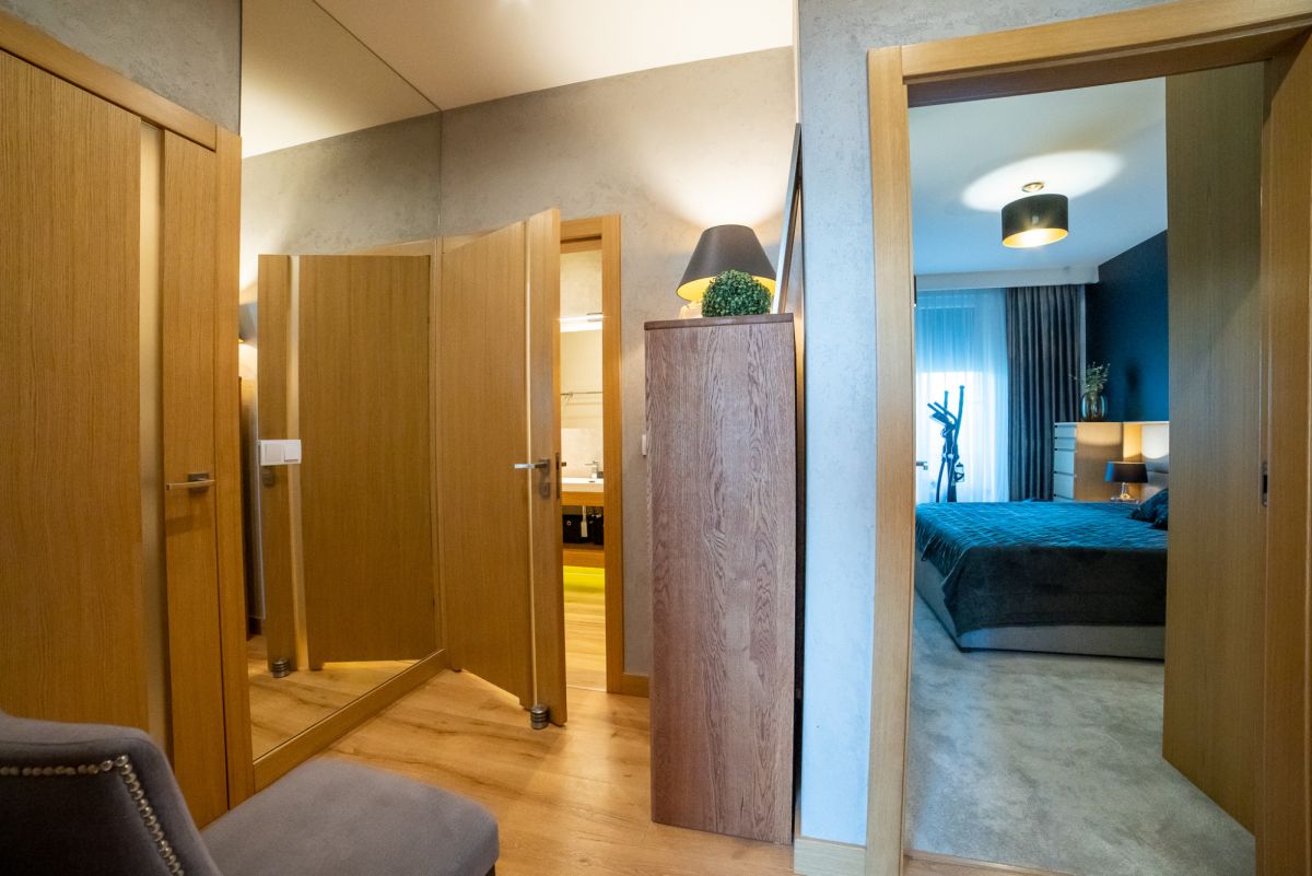 Wnętrze zostało wykończone w bardzo wysokim standardzie - większość zabudowy meblowej wykonana na zamówienie. Całość jest w pełni umeblowana i wyposażona w sprzęt AGD. Dodatkowym atutem jest klimatyzacja dostępna w całym mieszkaniu.