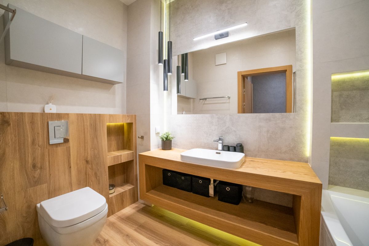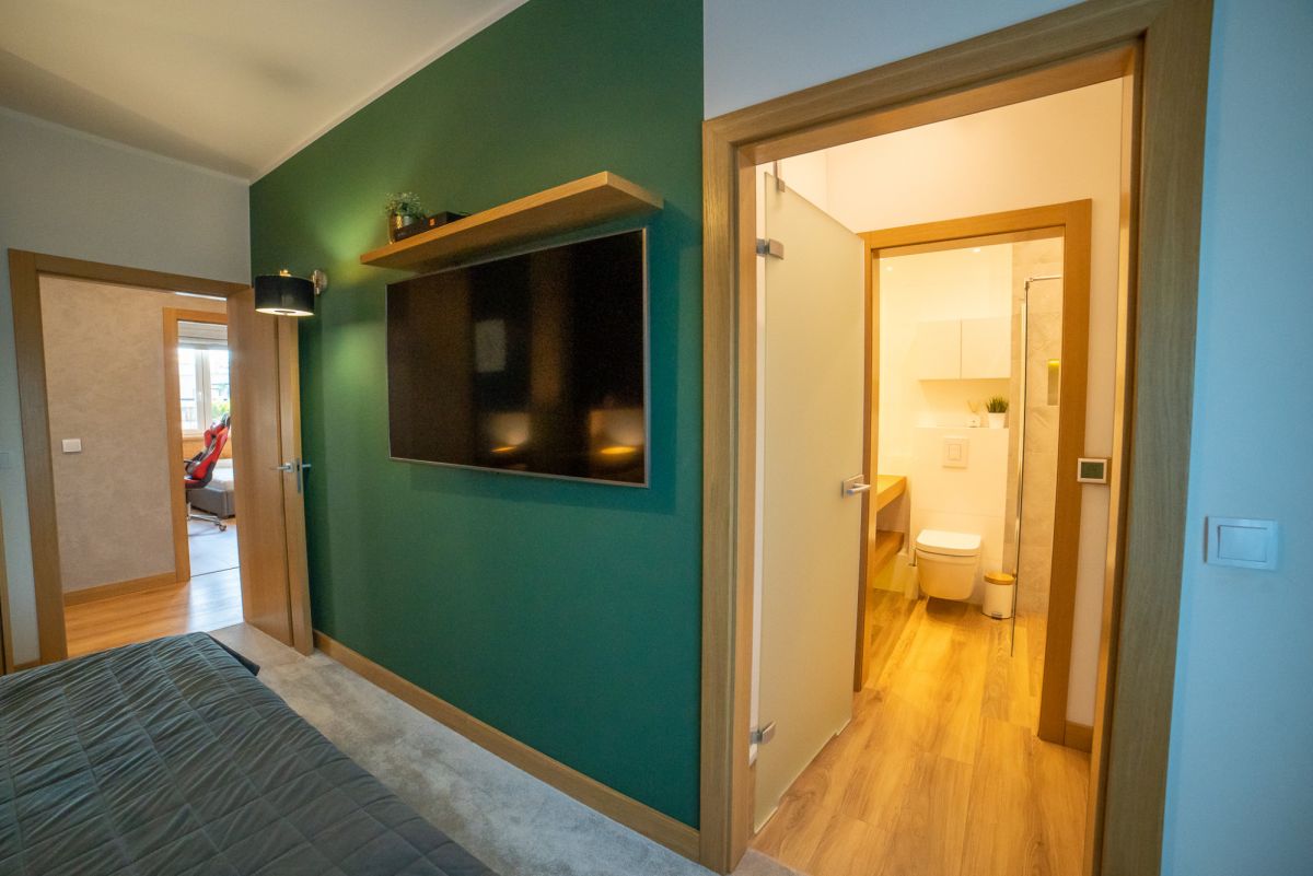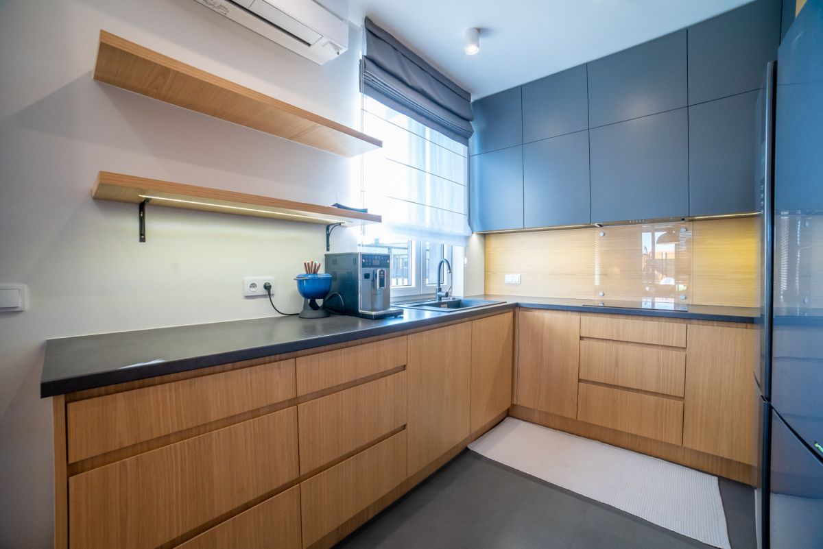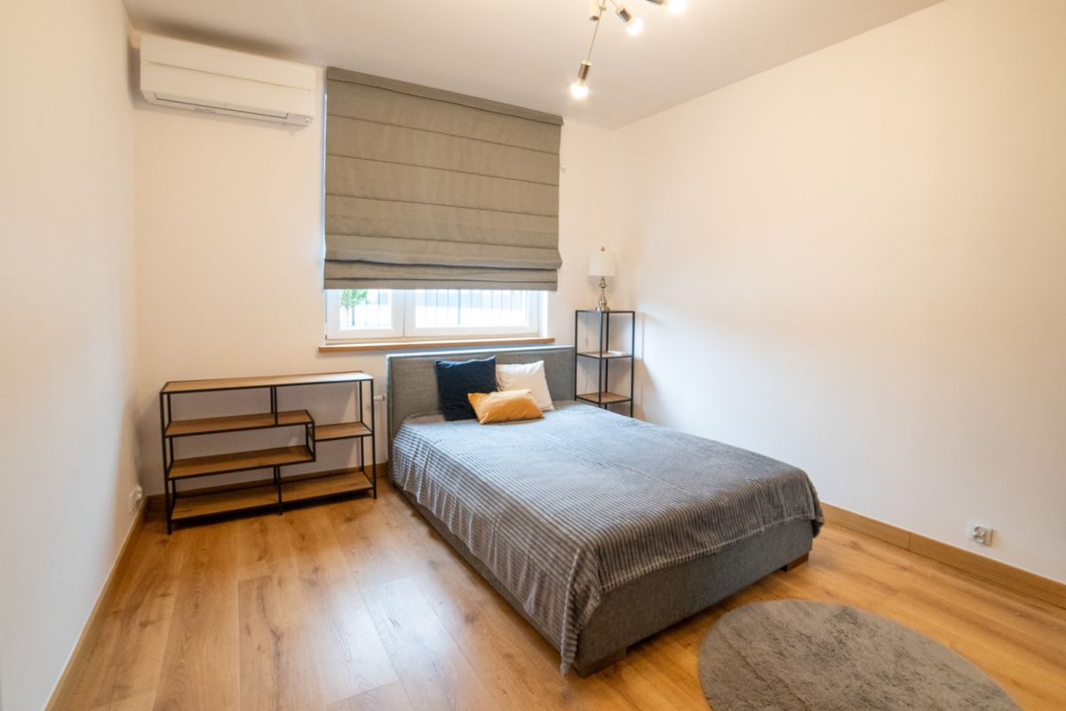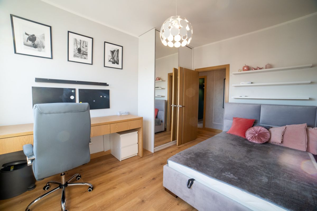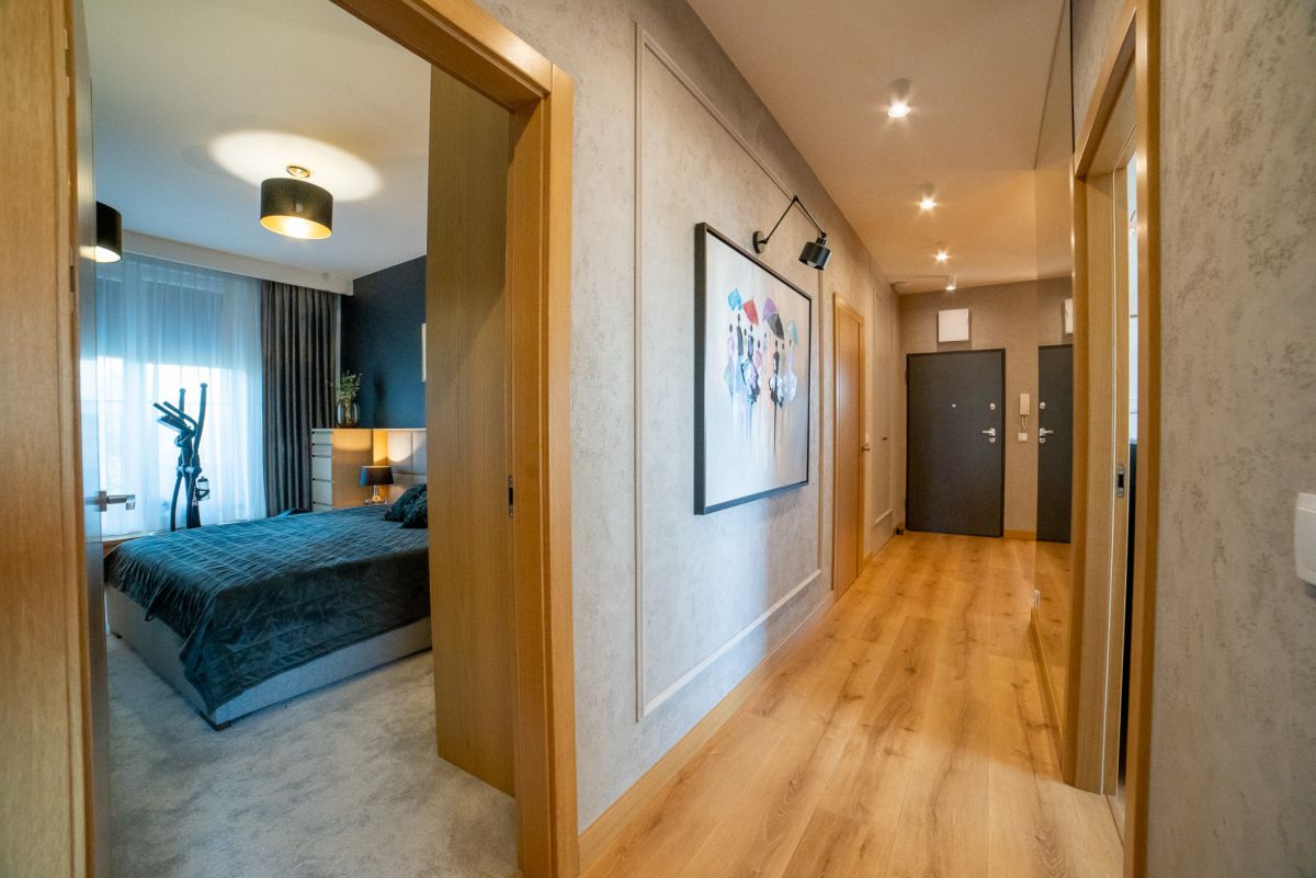 Wnętrze zostało wykończone w bardzo wysokim standardzie - większość zabudowy meblowej wykonana na zamówienie. Całość jest w pełni umeblowana i wyposażona w sprzęt AGD. Dodatkowym atutem jest klimatyzacja dostępna w całym mieszkaniu.
