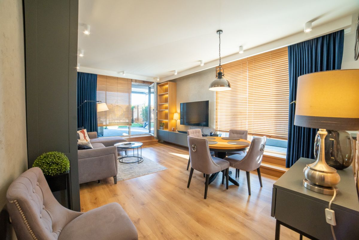 Z każdego z głównych pomieszczeń prowadzą wyjścia na dwa duże tarasy z prywatnym ogrodem o łącznej powierzchni ok. 70 m², co stanowi wyjątkową przestrzeń do relaksu i wypoczynku.