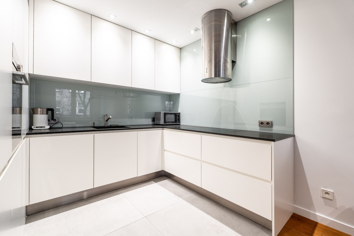 W salonie znajduje się również wyjście na balkon. Nowoczesna, w pełni wyposażona kuchnia. Widoczny okap, płyta, mikrofalówka, zmywarka Zabudowa kuchenna utrzymana w bieli, z czarnymi blatami i jasnoszarym szklanym panelem ściennym.